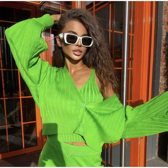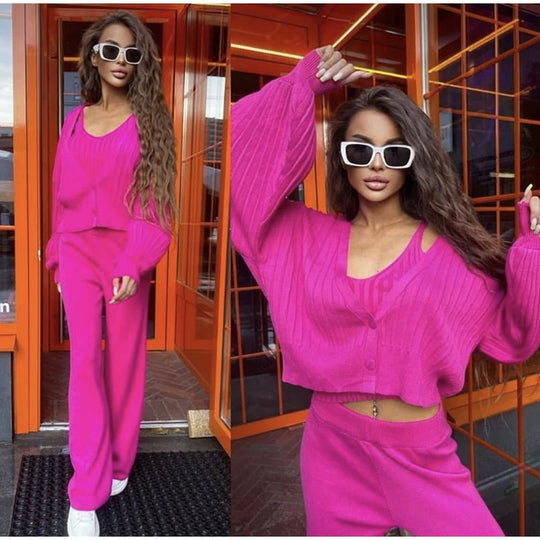 Our solid luxury three-piece set featuring a vest and a cardigan and pants is for sure a show stopper. Tracksuits are all-year round-the-clock best sellers. The knitting pattern and the chained vest add a touch to the aesthetics of the overall look.