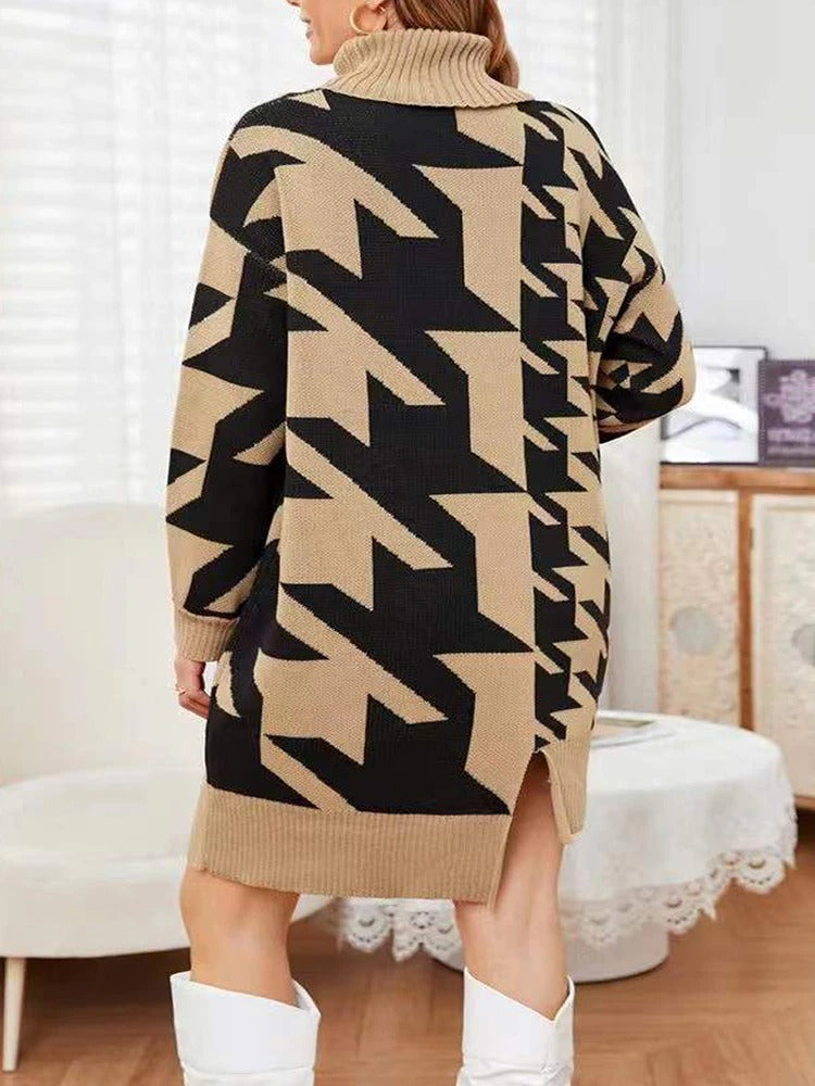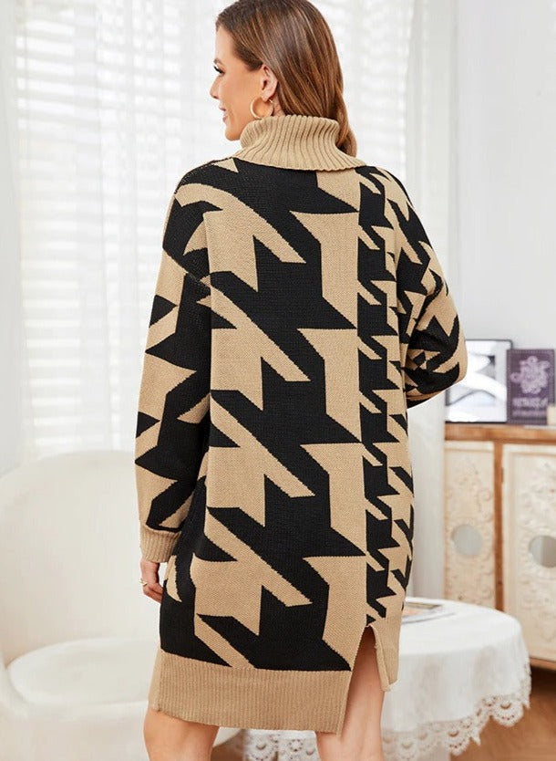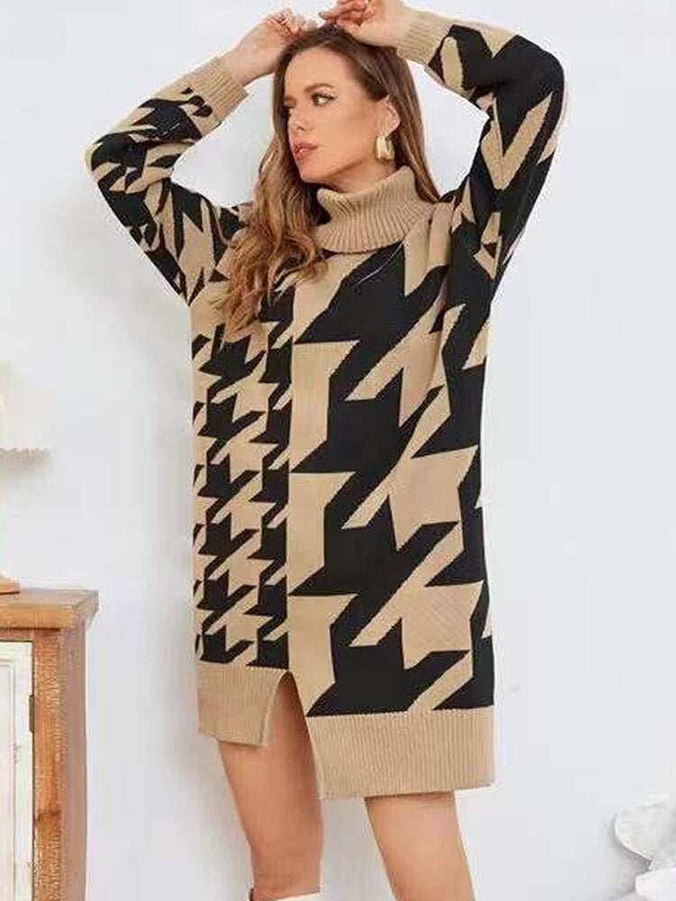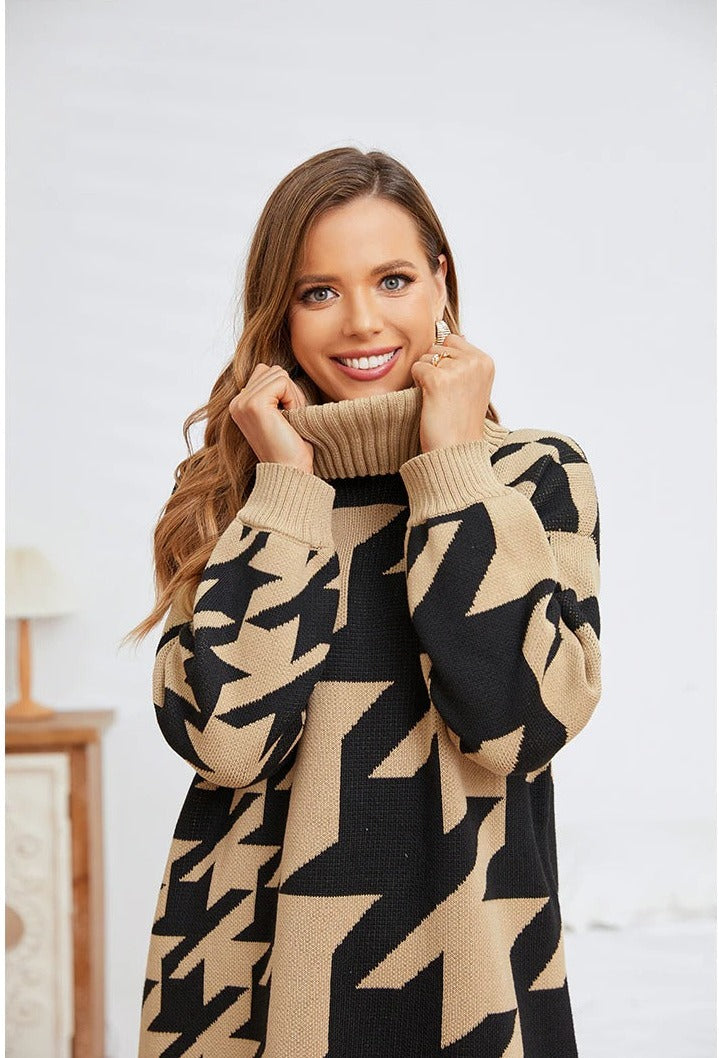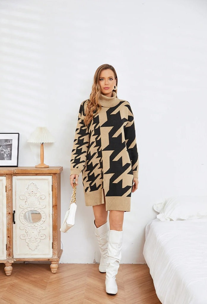 Our Oversized Sweater dress in the imported knitted fabric featuring a high neck, long sleeves, and a designer pattern is for sure a show stopper. Oversized Dresses are a winter's must have. From an outdoor get-together to a comfortable look, these dresses are the perfect fit. The fusion of the chic look and luxury detailing just adds a touch to the aesthetics of the overall look.