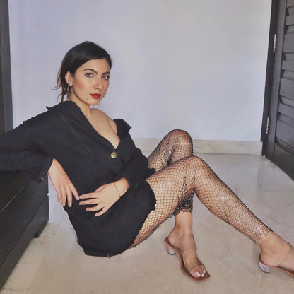Our high waisted fishnet trousers featuring rhinestones is for sure a show stopper. Fishnet trousers are a must have wardrobe Staple. From a day occasion, tonight's get-together, the mesh detailing just adds a touch to the overall look's aesthetics.