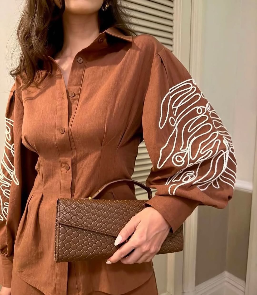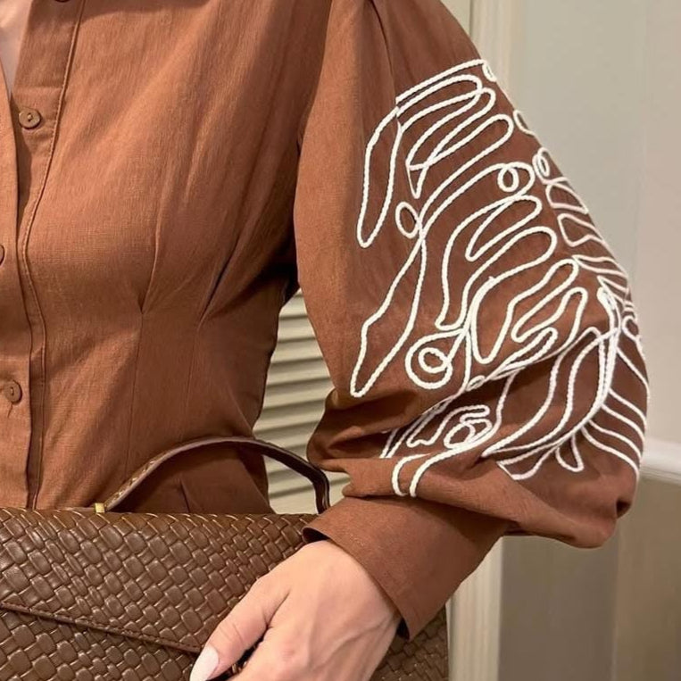 Features: accentuated waist, button down shirt, heavy embroidered sleeves
