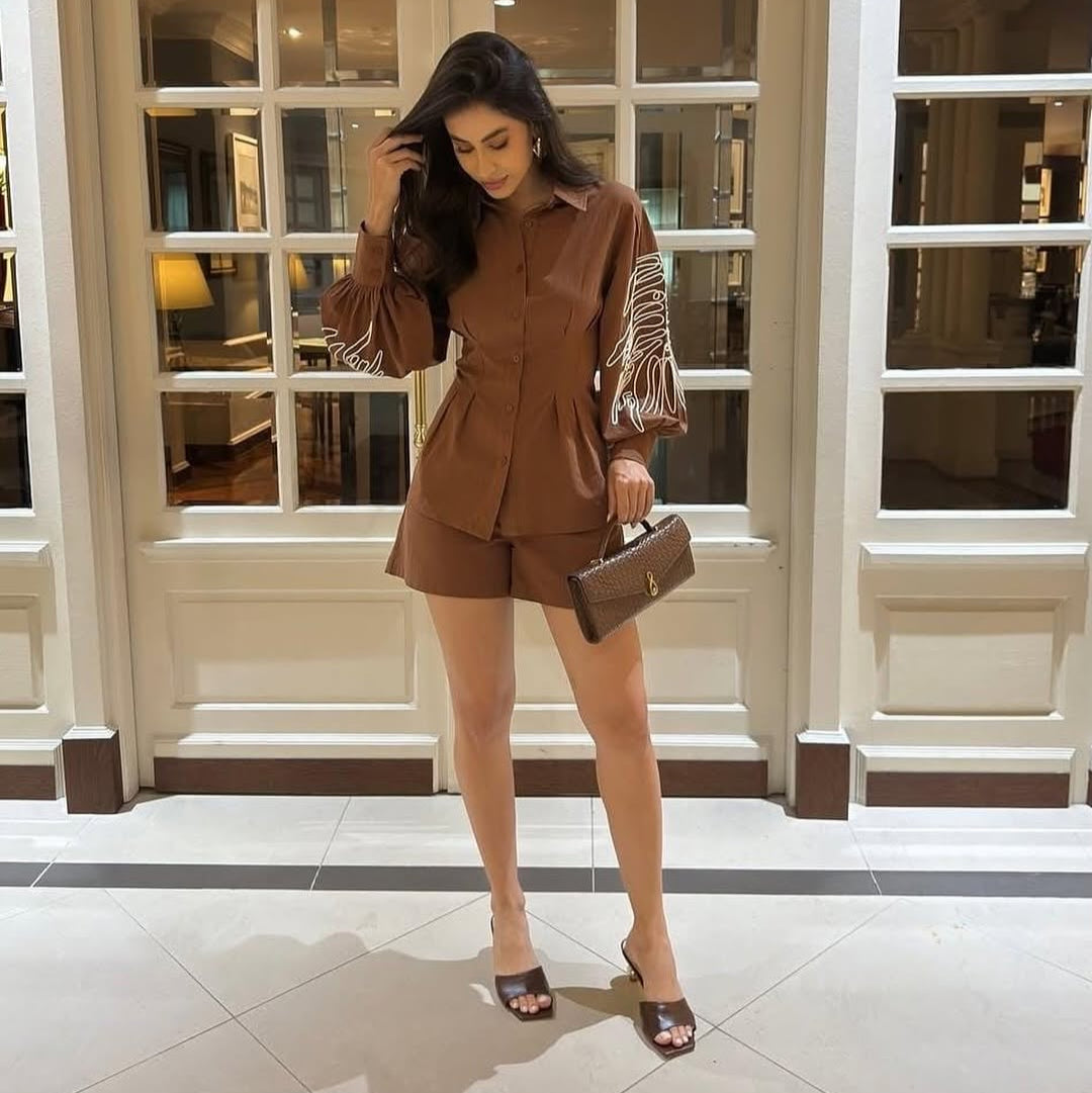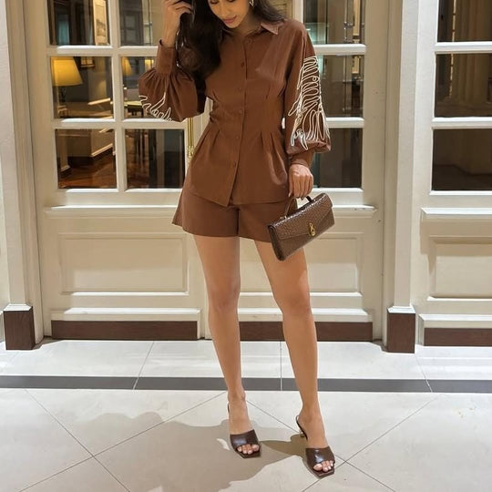 Our coordinated set featuring a thick embroidery weave on sleeves with accentuated button down shirt and cordinated shorts is for sure a show stopper. Coord sets are all year-round clock best sellers. From a day occasion, tonight's get-together, the thick embroidery with accentuated just add a touch to the overall look's aesthetics.
