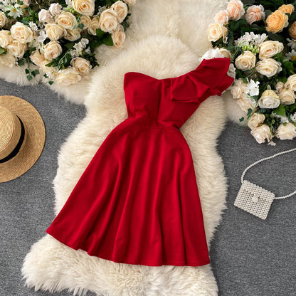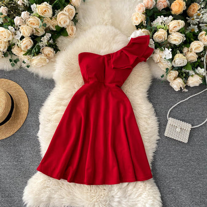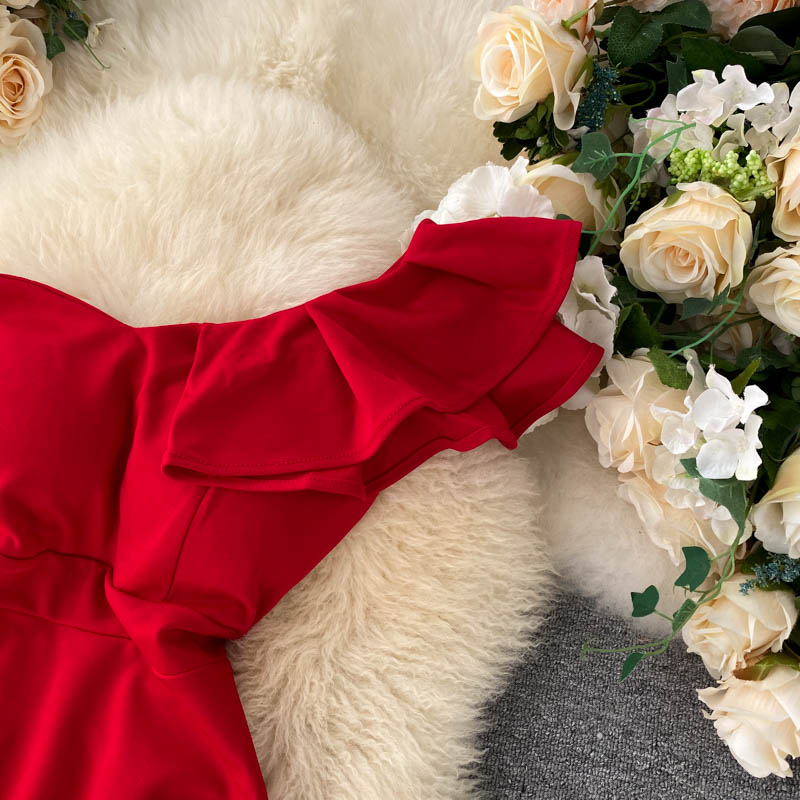 Our One shoulder mini dress in best selling colors featuring ruffle sleeve and one shoulder is for sure a show stopper. Mini Dresses are all year round clock best sellers. From a day occasion tonight get-together, the ruffle sleeves just add a touch to the aesthetics of the overall look.