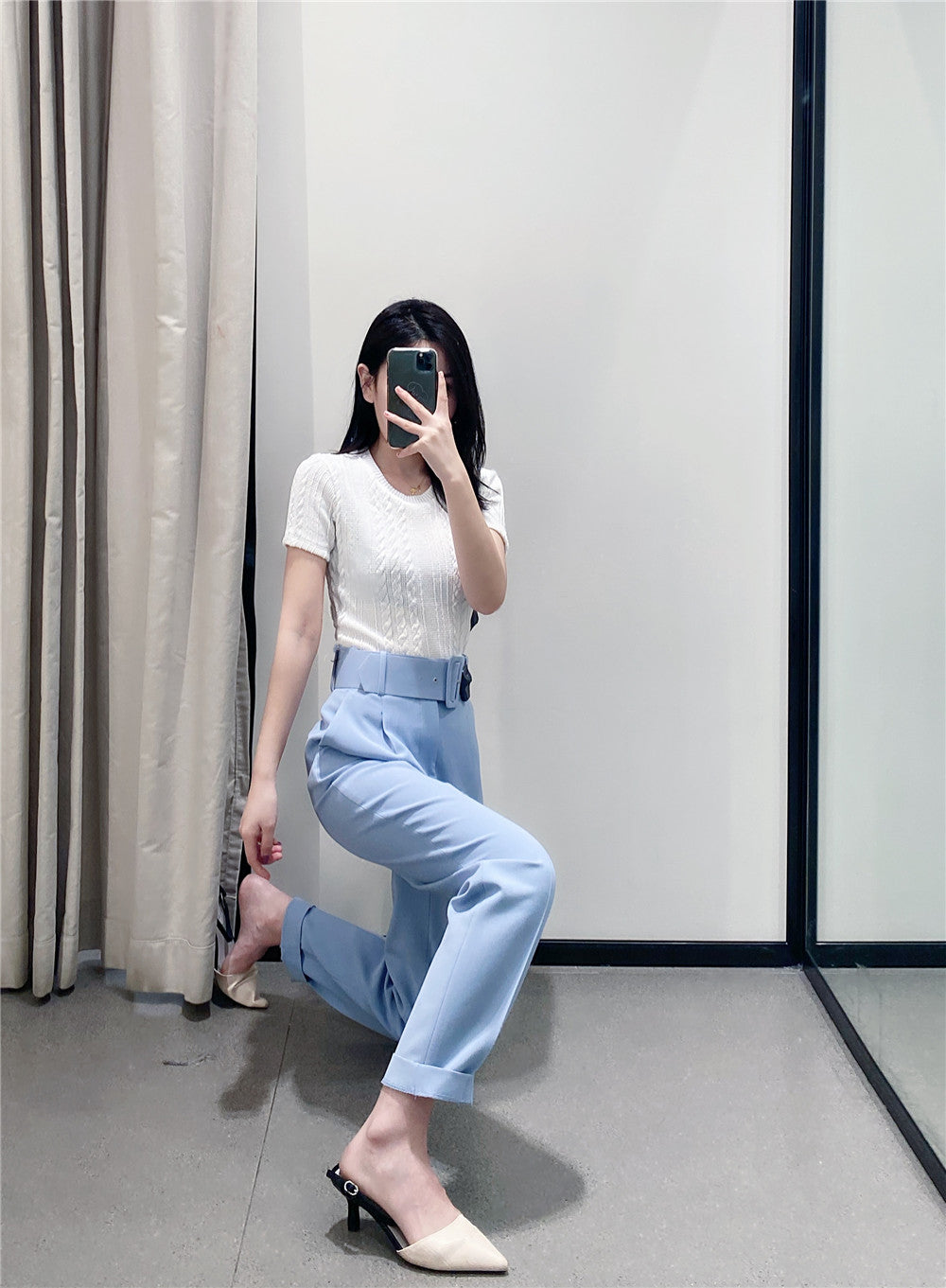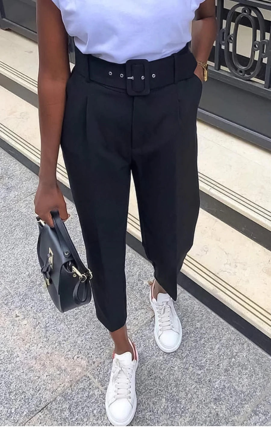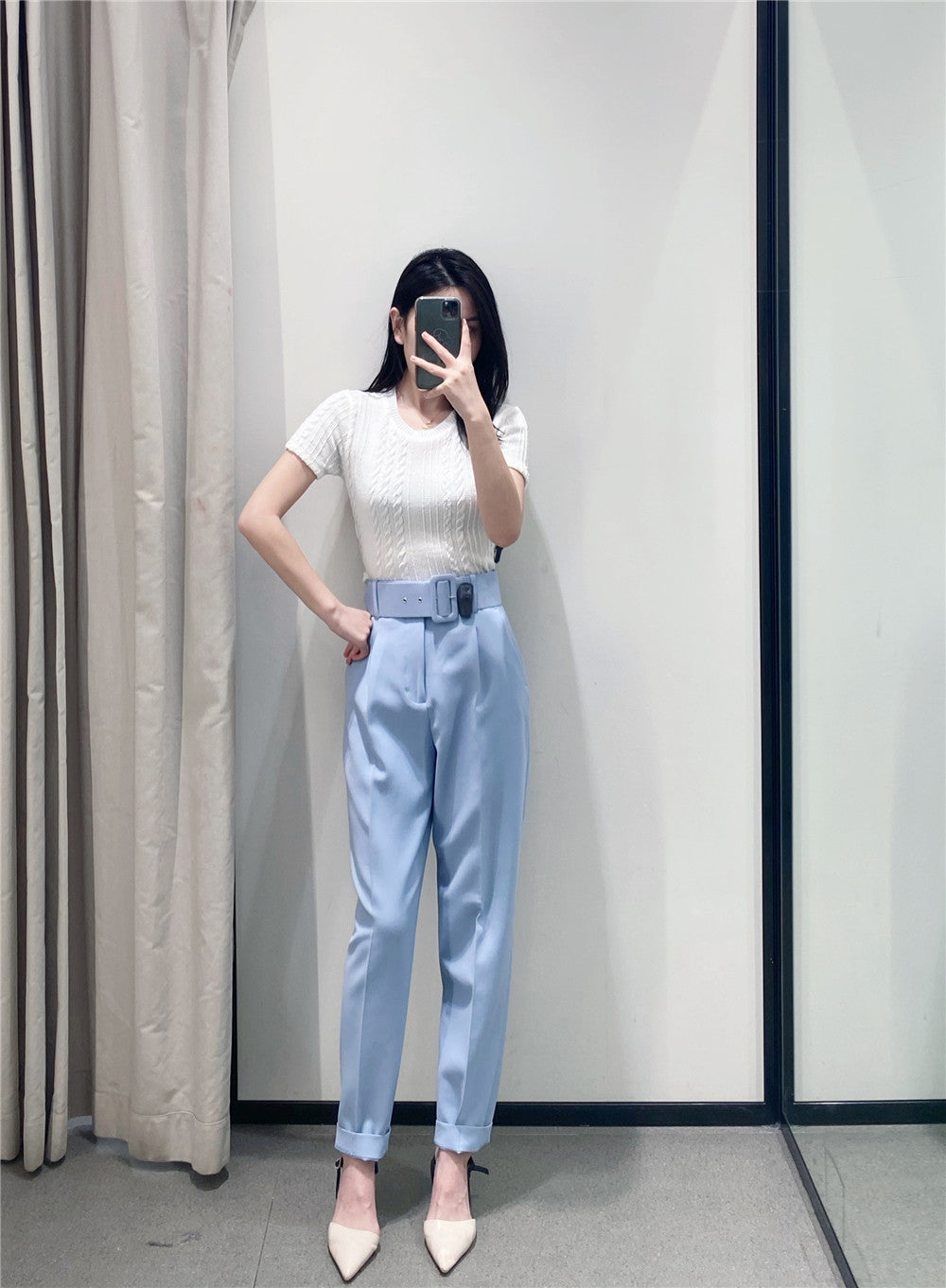 Features: Belt in front, high waisted