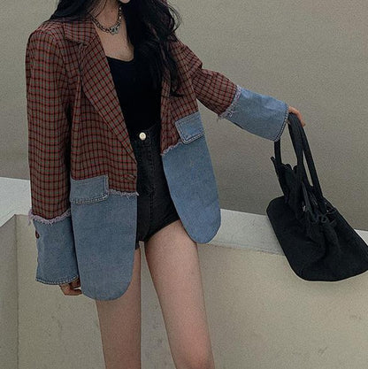 Our Plaid Blazer fabric featuring a classic lapel with Denim Patchwork is for sure a show stopper. Plaid Blazer are all year round clock best sellers. From a day occasion to a get-together, denim patchwork just adds a perfect touch to the aesthetics of the overall look.
